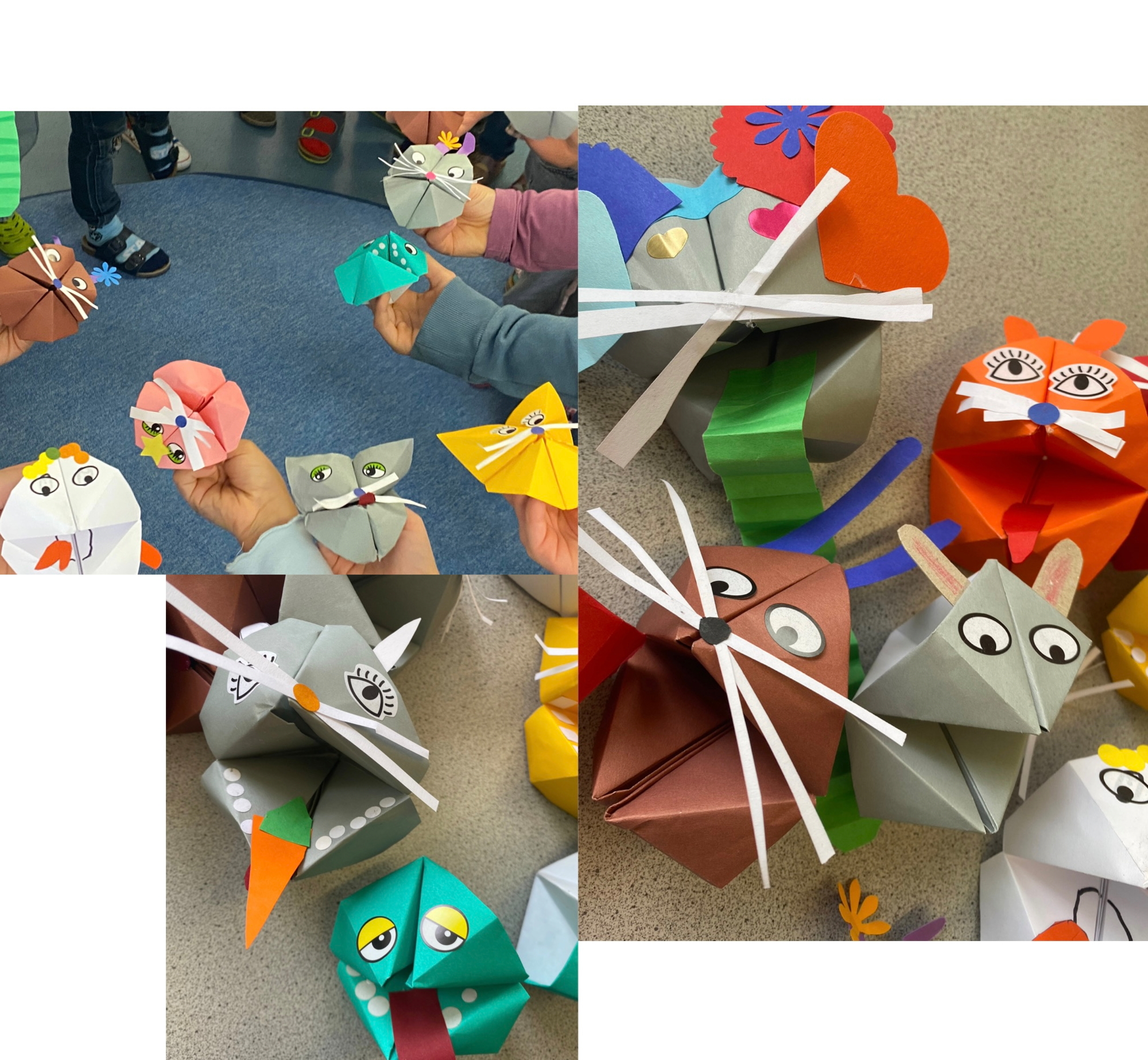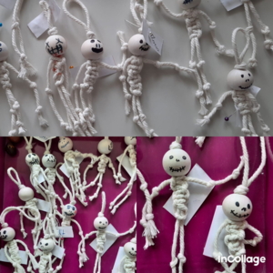 Links oben und unten präsentieren unsere Viertklässler ihre Makramee-Arbeiten, begleitet von ihrer Lehrerin und der Rektorin Frau Birgit Schlamminger.