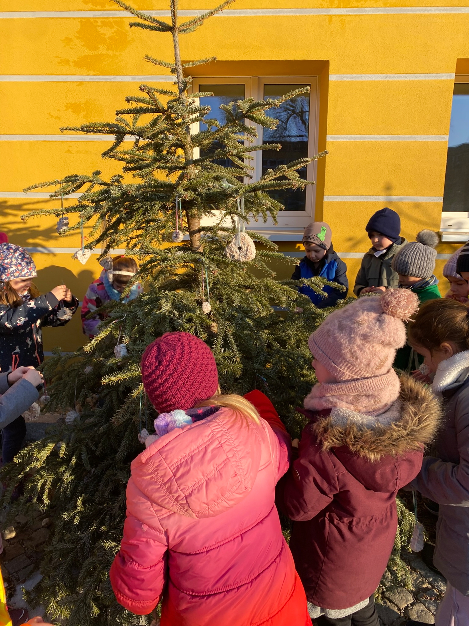 Unser Christbaum in der Schulaula bekam nun endlich sein zweites Leben im Pausenhof: Geschmückt mit selbstgemachten Futterstücken sowie den befüllten Tassen und Tontöpfen dient er jetzt als Futterbaum für viele hungrige Vögel. Mit Stolz hängten die Kinder ihre Werke auf.