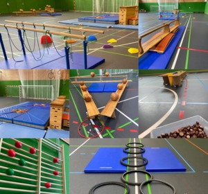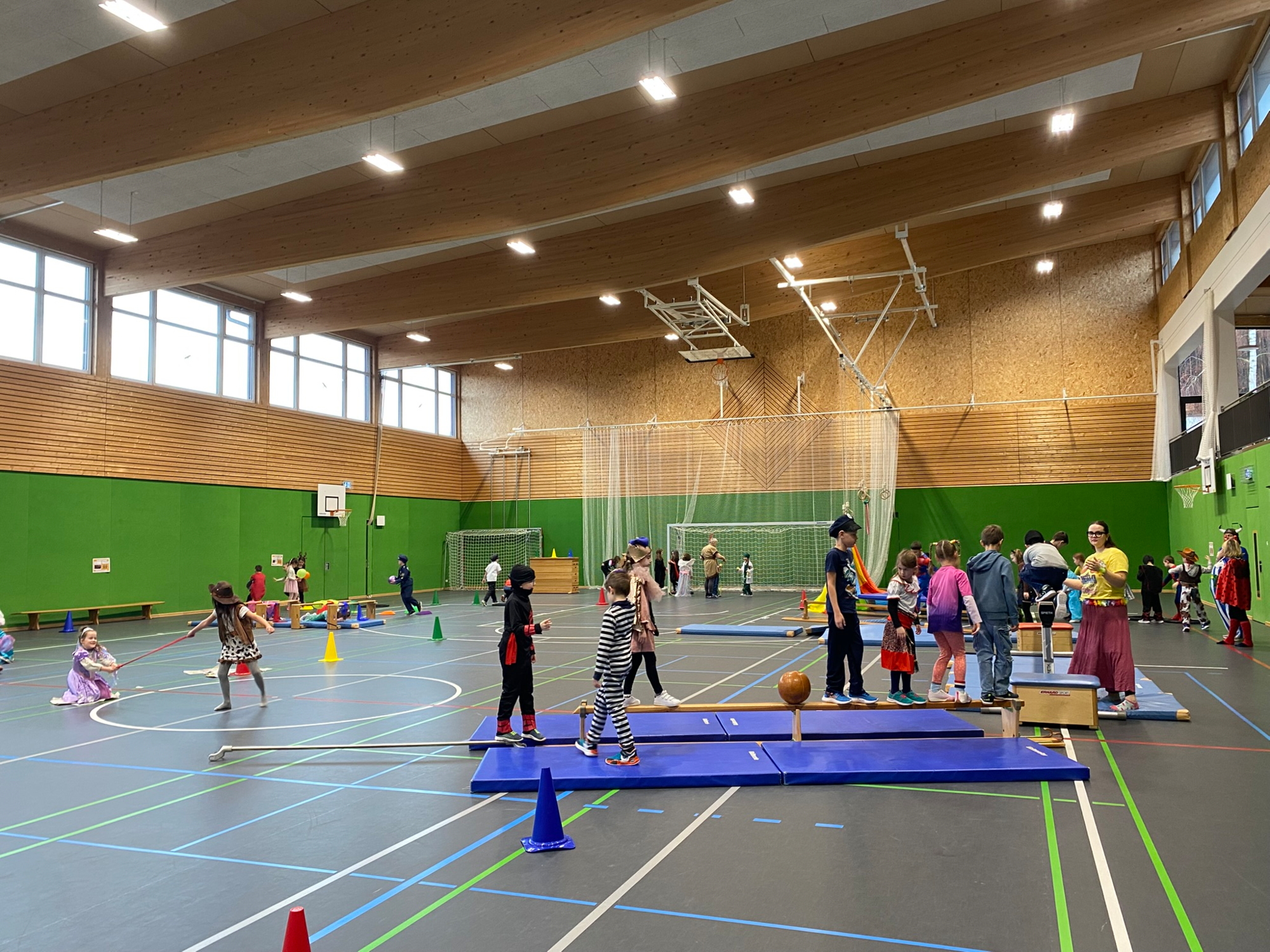 In der Turnhalle wartete dann eine ganz besondere Überraschung. Sie hatte sich in eine bunte Bewegungslandschaft verwandelt – passend zum Fasching mit fröhlicher Dekoration, Musik und vielen abwechslungsreichen Bewegungsangeboten.