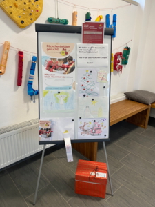Die Kinder versuchten im Eisregel-Training aus einem „Eisloch“ aus Turnkästen zu klettern. Gar nicht so einfach, weiß die Retterin der DLRG. „Bei dieser Übung merken die Kinder, dass es fast unmöglich ist, alleine aus dem eingebrochenen Eis zu klettern, selbst wenn die Übung hier im Warmen und mit trockener Kleidung stattfindet.“ Weil es schwer ist, sich selbst aus dem eingebrochenen Eis zu befreien, erlernten die Kinder Elemente der Fremdrettung – ohne selbst in Gefahr zu geraten.