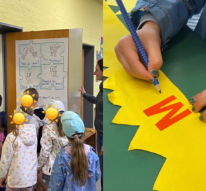 Zum Abschluss wurde kreativ gebastelt: Passend zum Buchstabenfest der 1. Klasse entstanden bunte Kronen mit den Namen der Vorschulkinder. Die Erstklässler unterstützten ihre kleinen Gäste mit Freude und spürbarem Stolz.