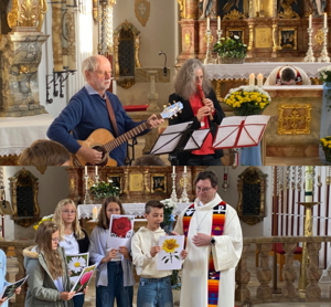 Die vorgetragenen Gedanken und Fürbitten wurden von den Kindern der dritten und vierten Klassen gelesen. Musikalisch wurde die Feier von unserer Rektorin Birgit Schlamminger und Herrn Anton Münch (Rektor a. D.) gestaltet. Ein herzliches Dankeschön für die feierliche und stimmungsvolle Begleitung! Ein besonderer Dank gilt auch unserem Stadtpfarrer Herr Dyadychenko, der den Gottesdienst leitete und mit seinen Worten bereicherte.