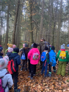 Am 25. November 2024 unternahm die dritte Klasse im Rahmen des HSU-Unterrichts eine spannende Exkursion in das nahegelegene Waldgebiet bei Rötz. Gemeinsam mit dem Ranger Christian Pregler vom Naturpark Oberer Bayerischer Wald machten sich die Kinder zu Fuß auf den Weg, um die heimische Natur mit allen Sinnen zu erleben. Spielerisch und mit viel Begeisterung vermittelte der erfahrene Naturpädagoge den Schülerinnen und Schülern interessantes Wissen über Bäume, Tiere und das ökologische Gleichgewicht des Waldes. Durch anschauliche Lernspiele konnten die Kinder das im Unterricht Erlernte direkt in der Natur anwenden und vertiefen. Gegen Mittag kehrten alle mit vielen neuen Eindrücken und Erlebnissen zurück zur Schule.