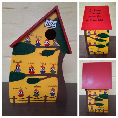 Zum Abschied haben unsere Viertklässler ihre Namen auf einem liebevoll gestalteten Vogelhaus hinterlassen. Wie kleine Vögel, die flügge werden, fliegen sie nun hinaus in neue Abenteuer. Im neuen Schuljahr wird das bunte Häuschen unseren Schulgarten schmücken und uns an viele schöne gemeinsame Momente erinnern.