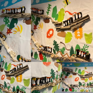 Die Kinder arbeiteten in Gruppen und planten eigenständig, wie sie ihre Ideen umsetzen wollten. Dabei entstanden farbenfrohe Tiere aus verschiedenen Recyclingmaterialien – darunter viele kleine Pinguine, Papageien, Affen und ein großer weißer Kakadu.
